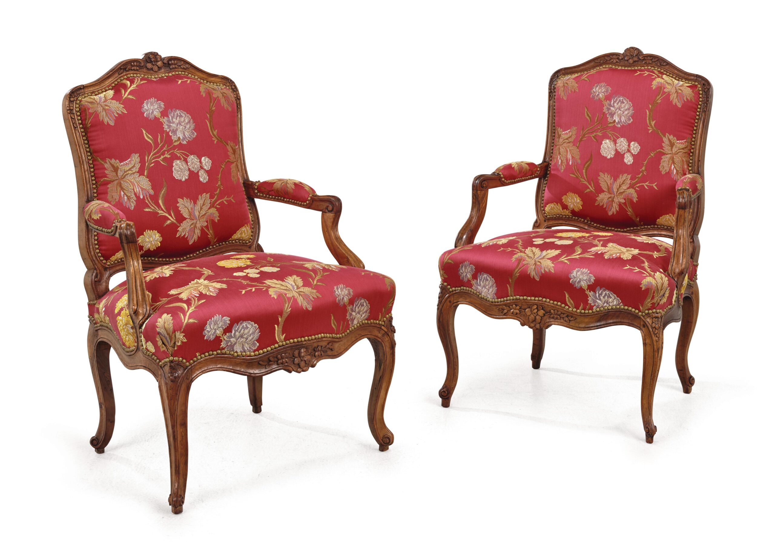 Epoche Louis XV, Mitte 18. Jahrhundert, geschweifte Buchenholzgestelle, teilweise profiliert gearbeitet und floral in Form von Blumen und Blättern beschnitzt, hochwertig erneuerte Sitz-, Lehn- und Armstützentapezierung, (Fischschuppen Imitationsbezug) 93 x 64 x 61 cm, Sitzhöhe 42 cm, restaurierter Zustand.