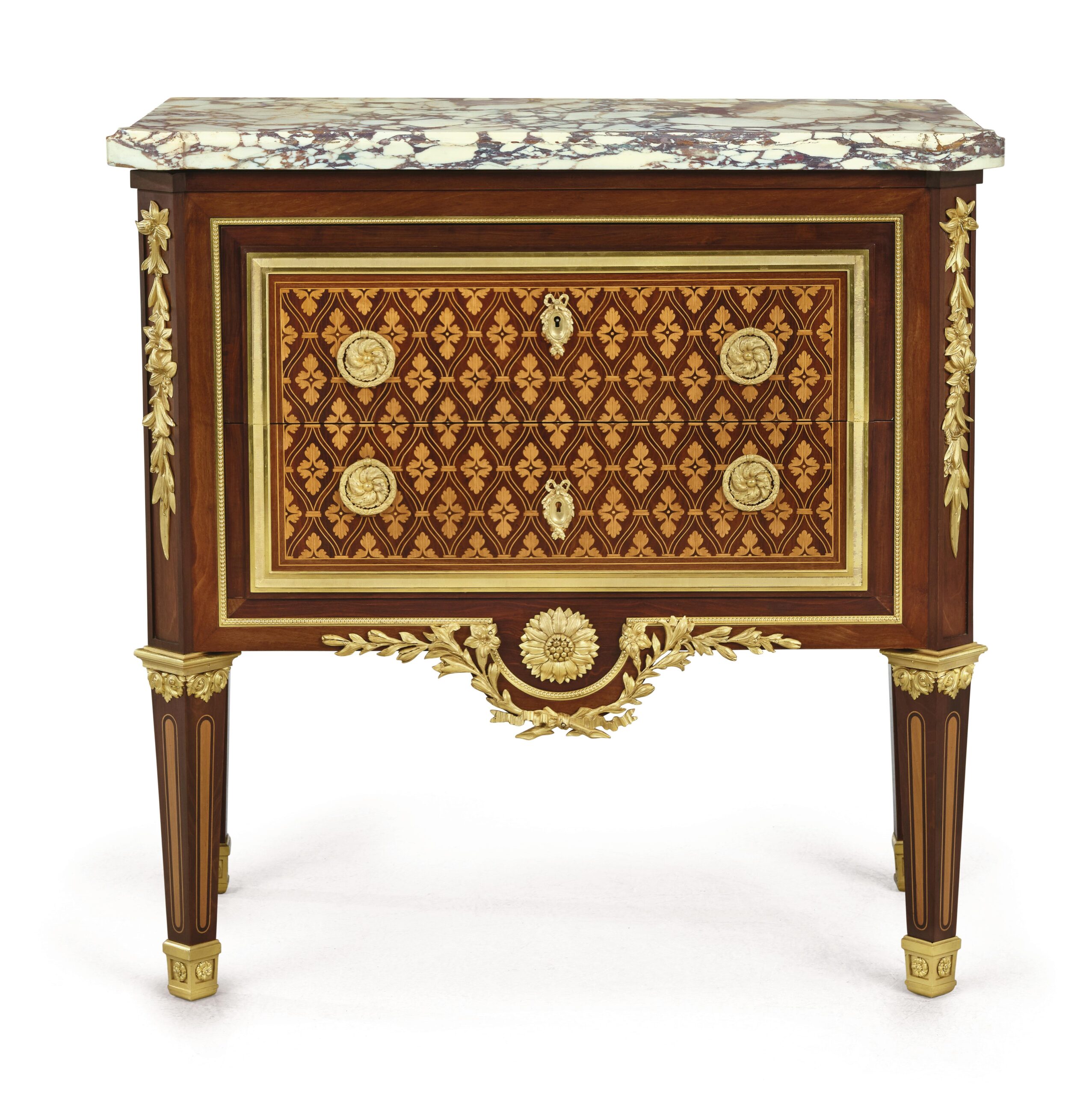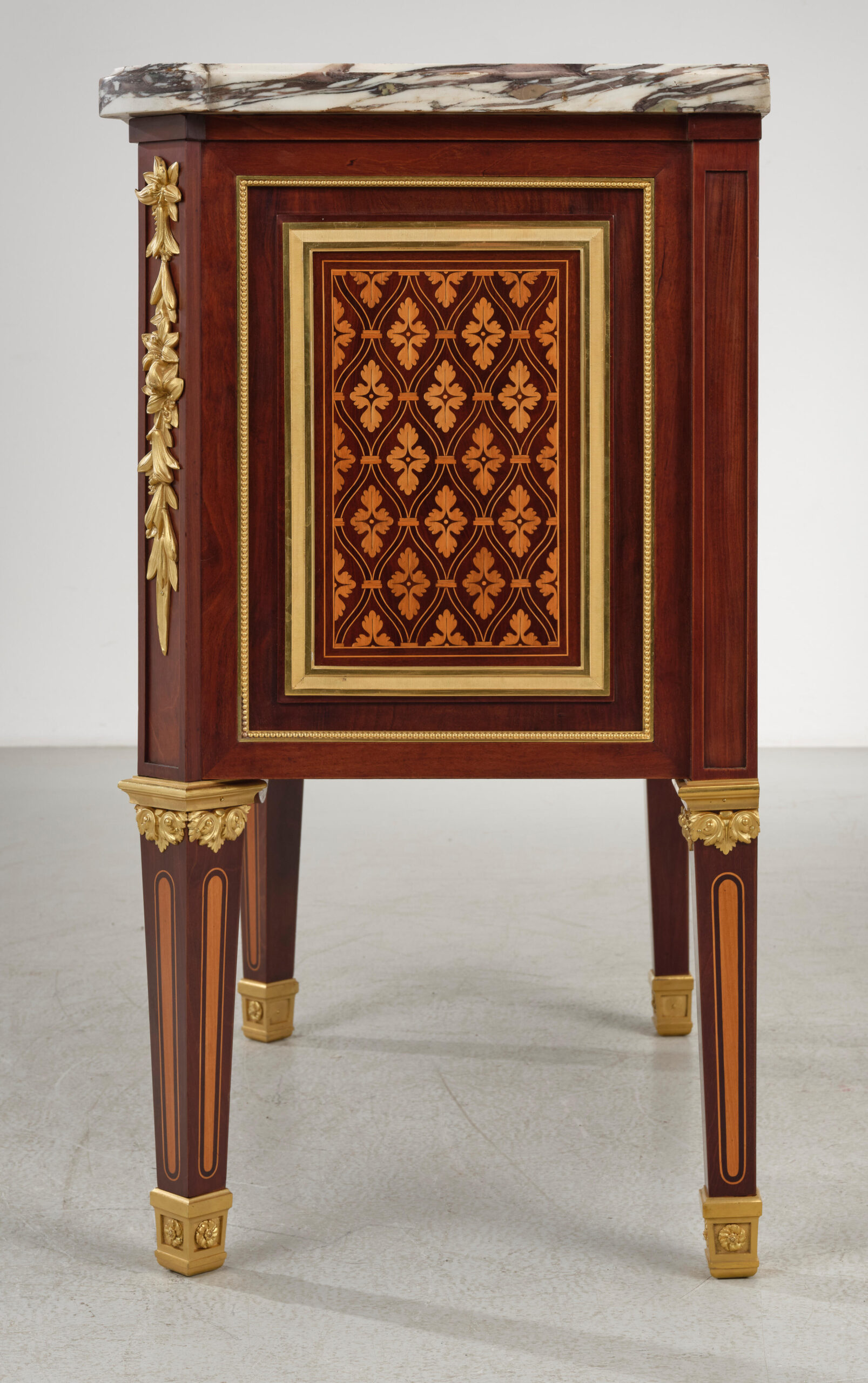 Elegante französische Salonkommode im Louis-XVI-Stil, gefertigt vom renommierten Ebenisten E. Brunet im letzten Viertel des 19. Jahrhunderts. Der Korpus besteht aus Eichenholz, ist mit Mahagonifurnier belegt und reich mit hochwertigen Edelholz-Marketerien verziert. Die Oberfläche wurde in traditioneller Handwerkstechnik sorgfältig poliert, während die vertieften Flächen mattiert sind – ein charakteristisches Qualitätsmerkmal exklusiver französischer Ebenistenkunst. Die Kommode verfügt über zwei Schubladen „sans traverse“ (ohne Zwischensteg) sowie fein ziselierte, vergoldete Bronzezierbeschläge. Eine profilierte Marmorplatte bildet den eleganten oberen Abschluss.