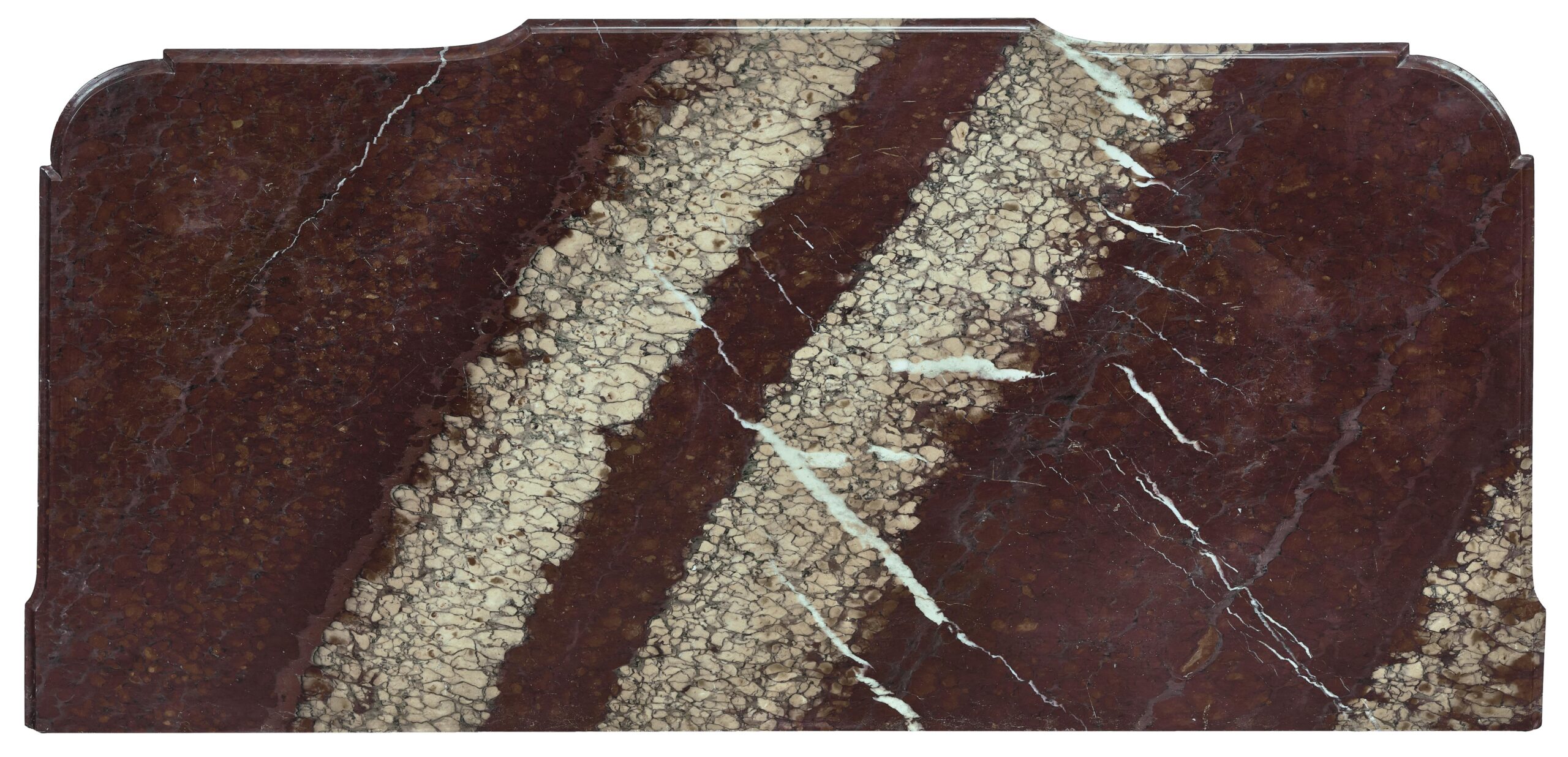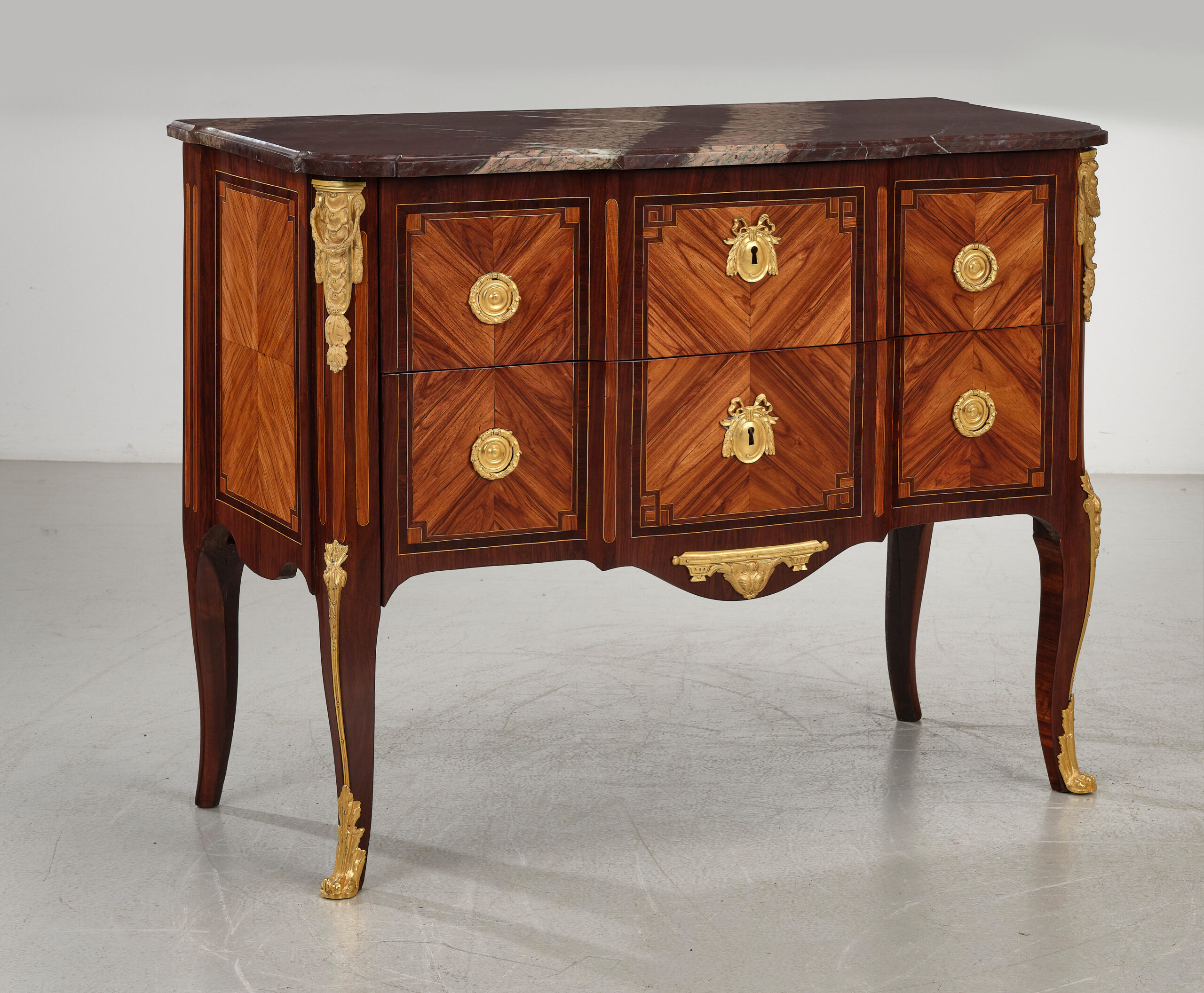 Seltene Kommode des Pariser Ebenisten François Reizell, Meister ab 1764, aus der Übergangszeit zwischen Louis XV und Louis XVI. Der Korpus aus Eichenholz ist mit Amaranth- und Rosenholz furniert und mit verschiedenen Edelhölzern feldförmig marketiert. In traditioneller Handwerkstechnik politiert, mit **zwei Schubladen ohne Traverse („sans traverse“) **und fein ziselierten, vergoldeten Bronzebeschlägen. Die profilierte Marmorplatte aus Campan Rubané rundet das elegante Erscheinungsbild ab.