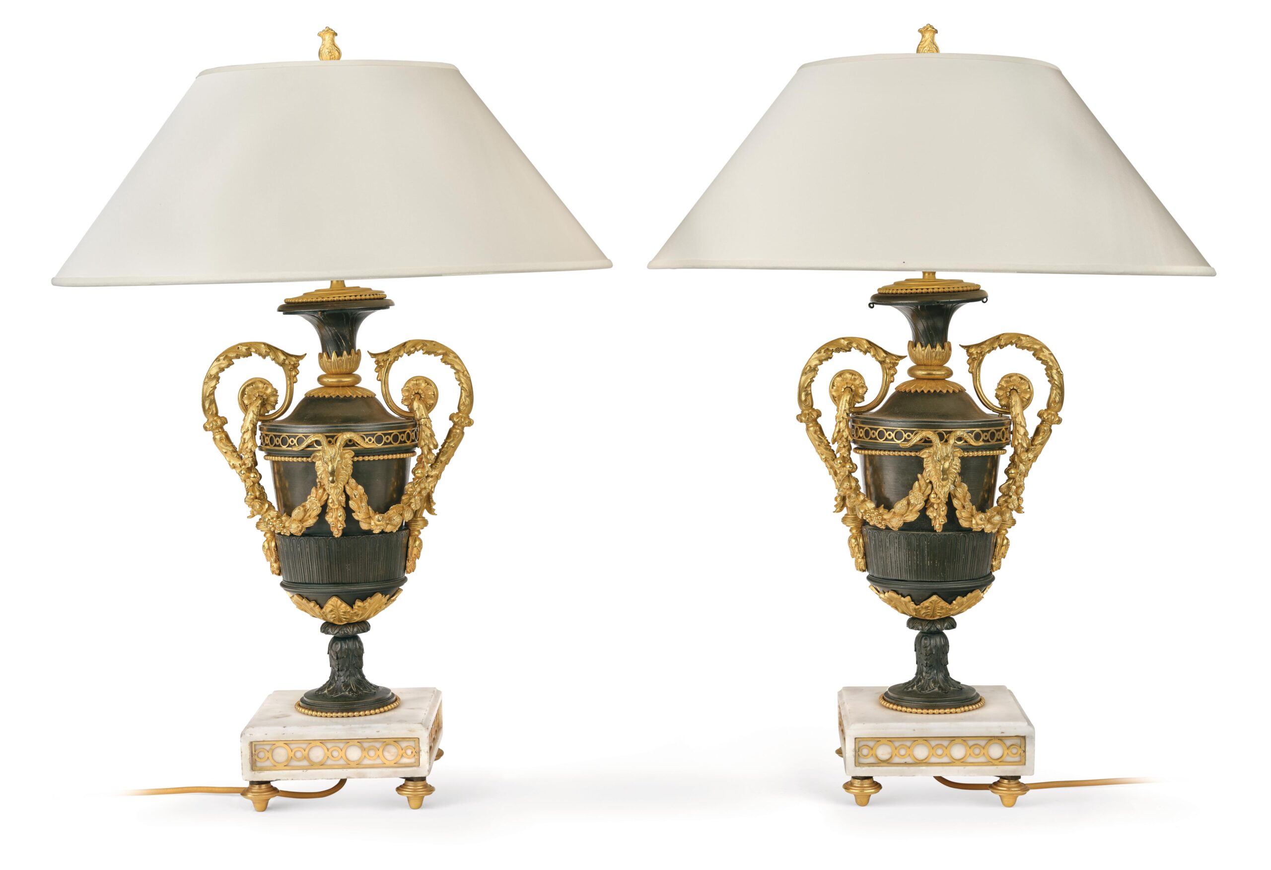 Decorative pair of table lamps, created using 19th-century ornamental vases which were later converted into elegant lighting pieces. The vases are crafted from bronze, richly adorned with festoon and ram-head motifs, characteristic of French neoclassical design.