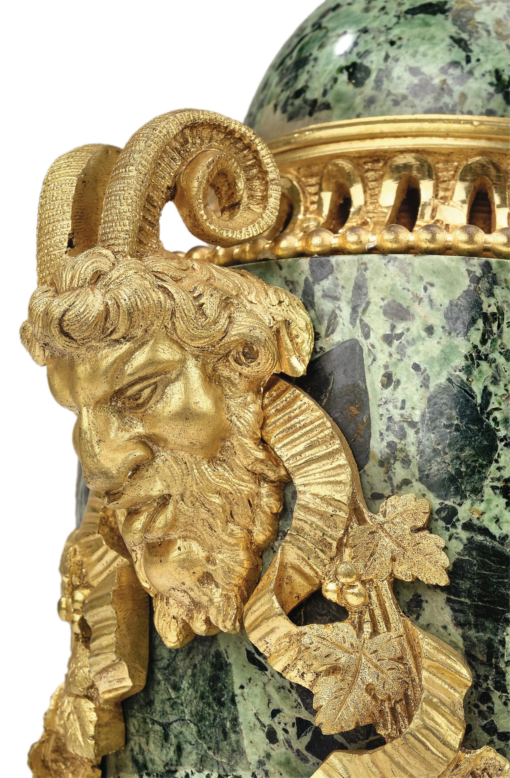 An elegant pair of decorative vases from France, dating to the late 19th century. Each vase features a shaft crafted from desirable Vert de Mer marble, complemented by finely chased and gilded bronze mounts. The decoration includes meticulously detailed foliage, expressive mascarons, and a classic pinecone finial on the lid. Standing 42 cm tall, the vases present themselves in a beautiful, well-preserved overall condition, embodying the refined decorative arts of late 19th-century France.